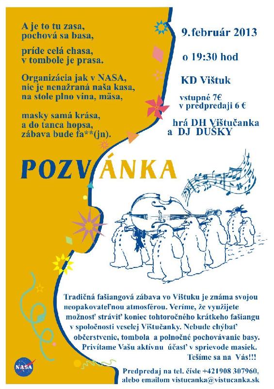 Príďte aj Vy 9. februára od 19:30 hod „dobiť baterky“ k nám do Kultúrneho domu Vištuk. Nezabudnite si pripraviť masky, lebo v nich ako každý rok budeme o polnoci sprevádzať basu k odpočinku v smútočnom sprievode a najoriginálnejšia bude odmenená.
