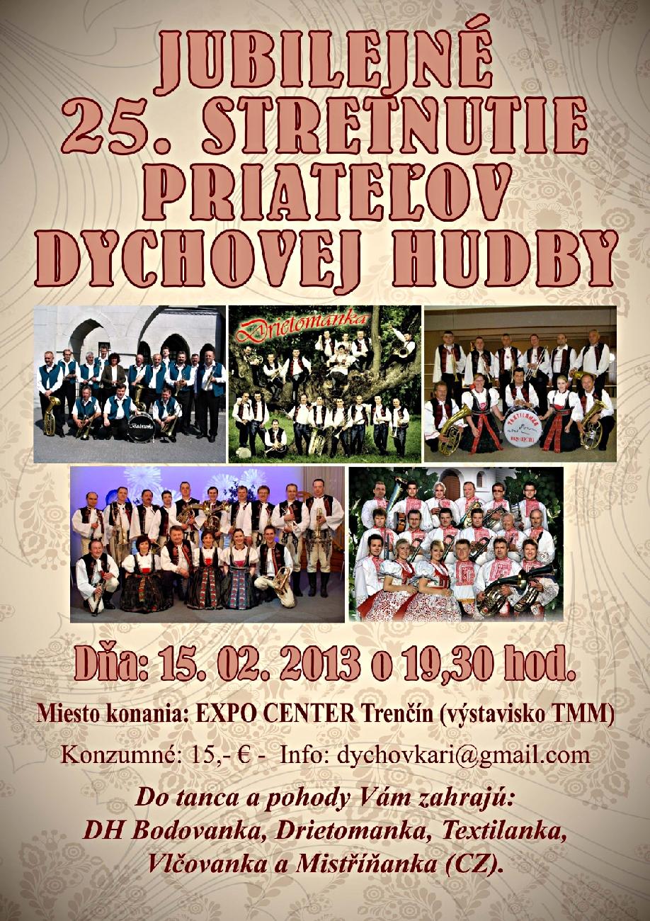 Tento rok sa konal už 25. ročník plesu Priaznivcov dychovej hudby. Dátum padol na 15. február 2013 a tak ako aj predchádzajúce roky sa konal na bývalom výstavisku Expo Center v Trenčíne.