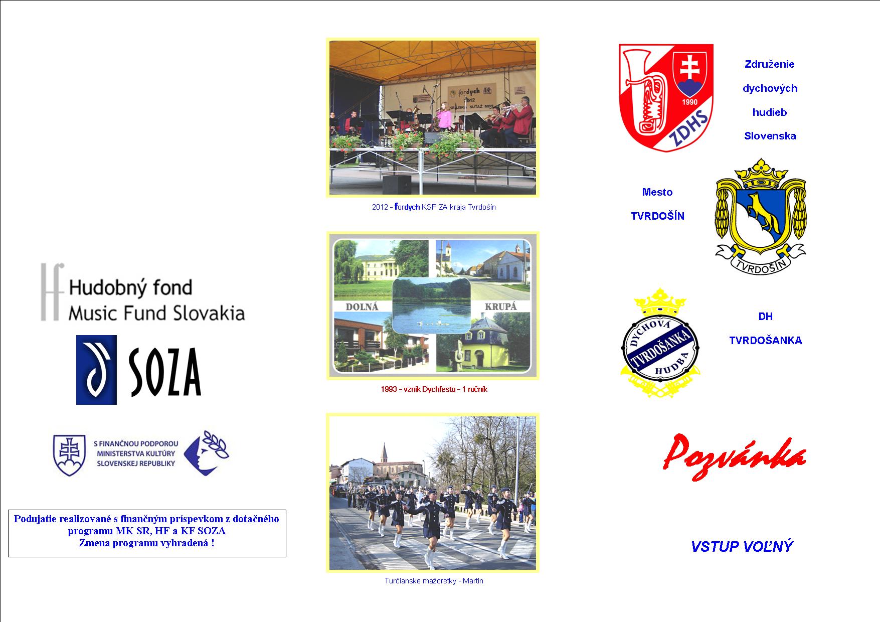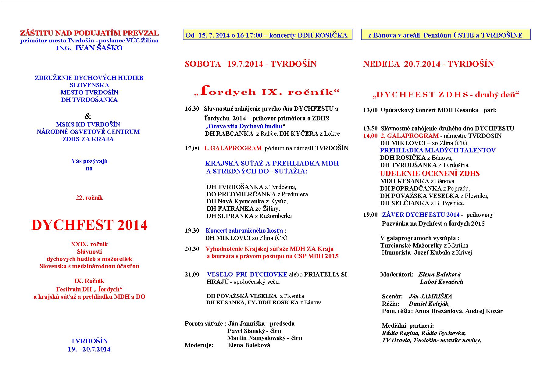 Srdečne Vás pozývame na 22. ročník DYCHFESTU ZDHS 2014, 29. ročník Slávností dychovej hudby a mažoretiek Slovenska a 9. ročník festivalu Žilinského kraja FORDYCH spojený s krajskou súťažou Malých dychových hudieb s právom postupu laureáta na VSP MDH v Lednických rovniach v roku 2015. Podujatia sa konajú pod záštitou primátora mesta Zvrdošín Ing. Ivana Šaška a ZDHS Žilinského kraja zastúpeného DH Tvrdošanka. Všetci ste s radosťou vítaní na dvoch dňoch dobrej dychovky. Ján Jamriška - ZDHS