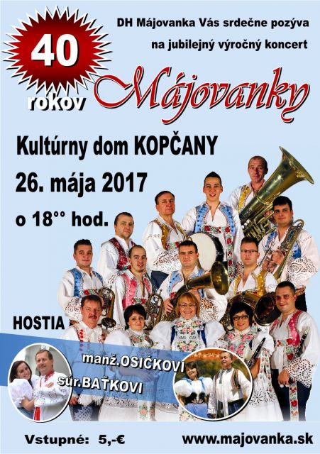 Všetkých priaznivcov dychovej hudby srdečne pozývame na jubilejný výročný koncert DH Májovanka z Holíča, pri príležitosti osláv štyridsiateho výročia  založenia tejto záhoráckej kapely. Koncert sa koná v piatok 26. mája 2017 o 18°° hod. v KD Kopčany.
