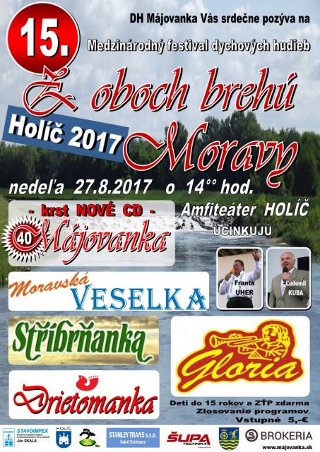 Srdečne Vás pozývame na XV. - ty ročník medzinárodného festivalu dychových hudieb, na ktorom 40 - ročná MÁJOVANKA, ktorá je organizátorom festivalu pokrstí svoj nový CD nosič. Podujatie sa uskutoční 27.augusta 2017 o 14°°hod. v amfiteátri v Holíči.
