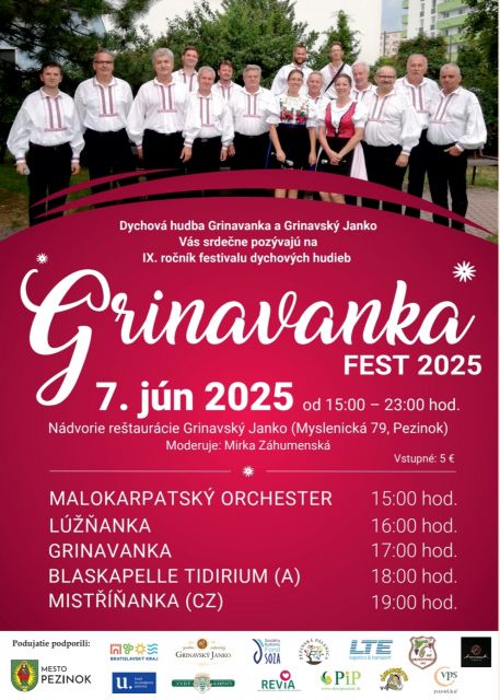 Organizátori podujatia - Dychová hudba Grinavanka a Gastro-catering Grinavský Janko Vás srdečne pozývajú na IX. ročník festivalu dychových hudieb s medzinárodnou účasťou Grinavanka FEST 2025 dňa 7. júna 2025 od 15:00 do 23:00 hod., ktorý sa uskutoční tradične na nádvorí reštaurácie Grinavský Janko, Myslenická 79 v Pezinku. V rámci festivalu sa budú prezentovať Malokarpatský orchester, dychová hudba Lúžňanka z Liptovskej Lužnej, domáca dychová hudba Grinavanka, Blaskapelle Tidirium z Rakúska a dechová hudba Mistříňanka z Česka. Po skončení koncertovania jednotlivých kapiel pokračuje podujatie ľudovou zábavou s DH Mistríňanka. Nebude chýbať ani tradičná tombola, bohatá ponuka domácej kuchyne reštaurácie Grinavský Janko a pečené prasiatka, ponuka grinavských a pezinských vín.